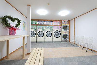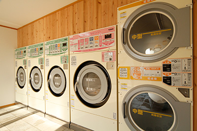 大型のランドリー完備。コイン式でご利用いただけます。物干しスペースもご用意しております。